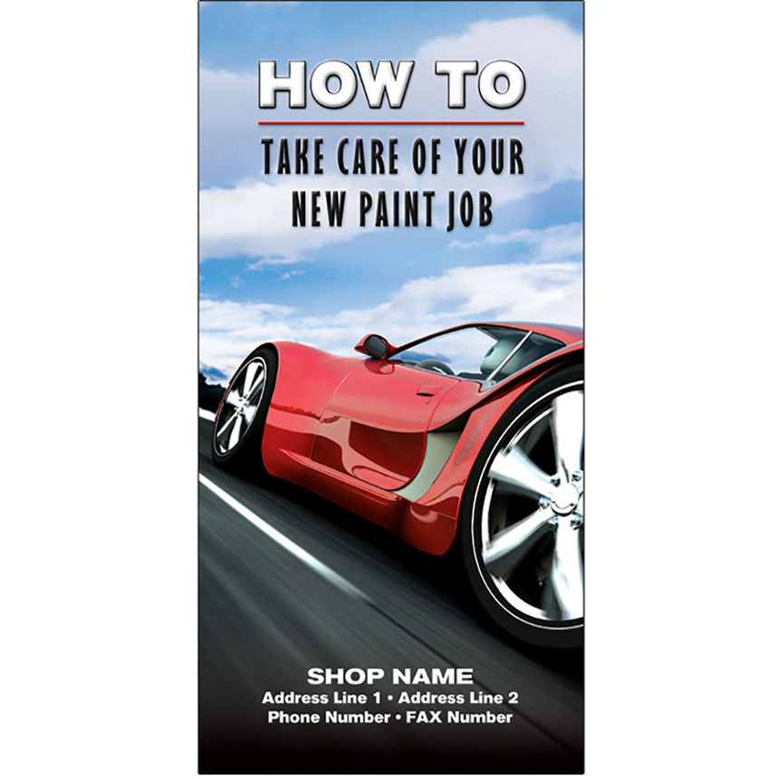 Explains how to take care of fresh paint after the car is delivered, from washing and waxing, to sun protection and rock chips. Use this great confidence builder when delivering the repair to the customer, or use it as a sales tool before the job to inform your customer that you know how to protect the paint on their vehicle. Two great looking styles to choose from.