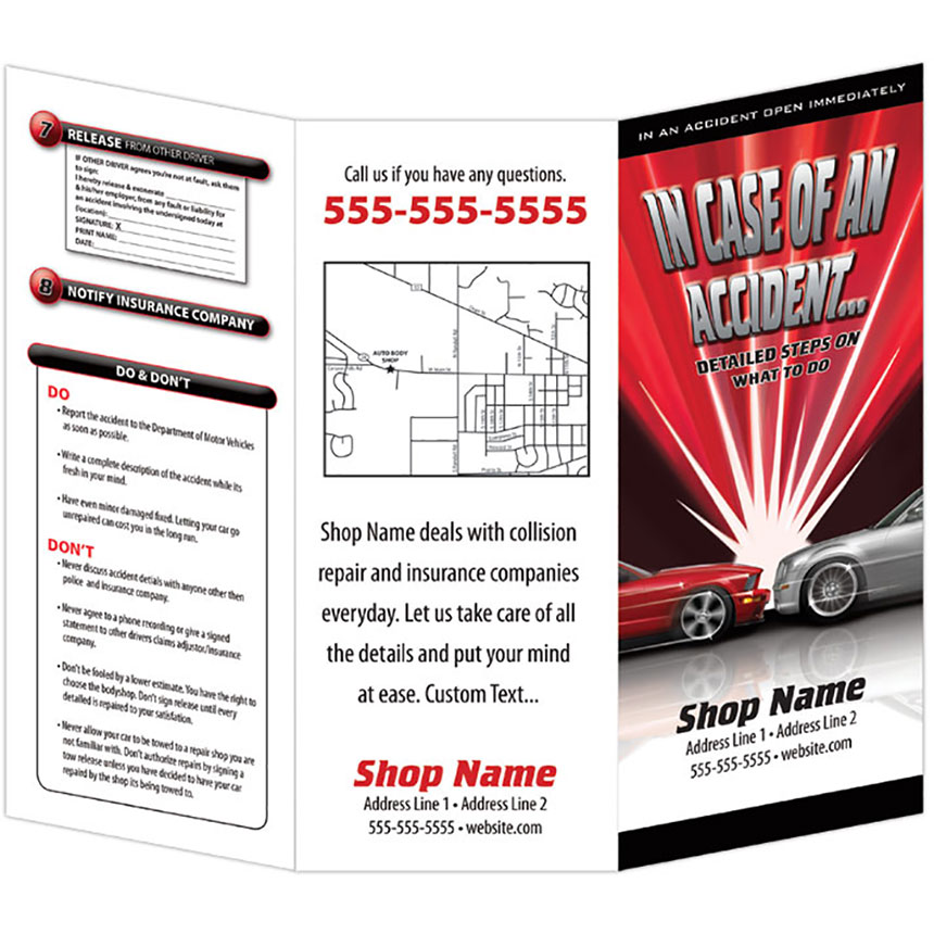 Gives your customers 8 easy steps to follow when in an accident. Accidents can be confusing and your customer will appreciate this brochure that aids in their safety and legal protection. Your information will be imprinted if they have any questions or need any services. One of the best ways to be there for your customer when they need you the most.