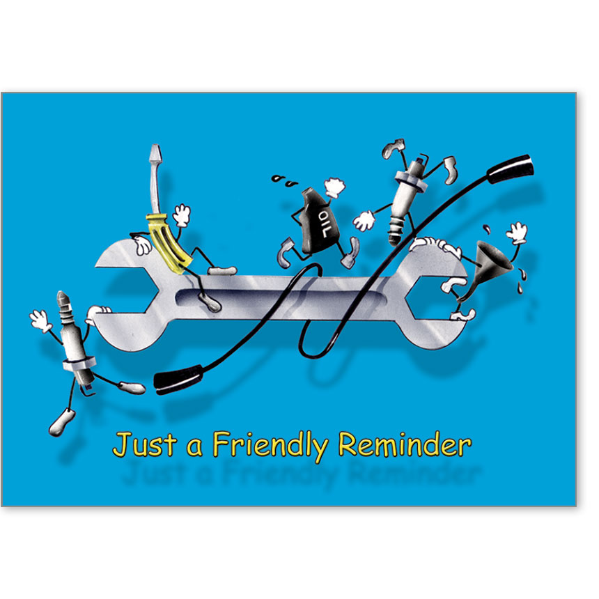 These fun, colorful designs will brighten anyone's day! Use them to remind customers of needed service. Choose from the standard messages for the back at NO additional charge!