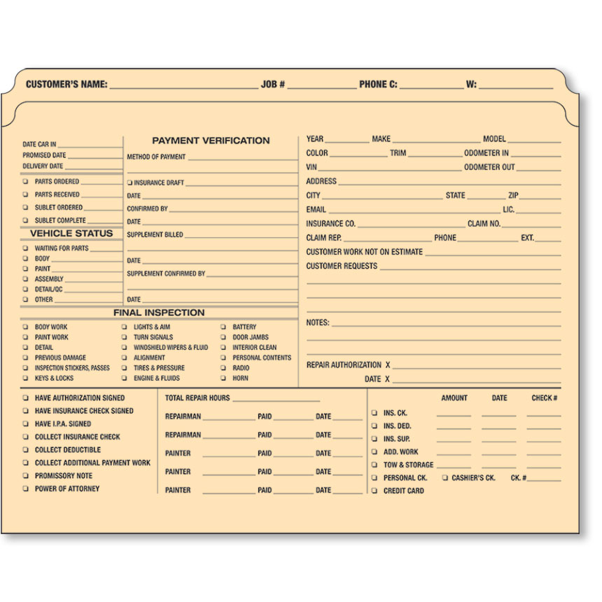 This new folder doubles as a job folder and check-in form all-in-one! The front includes all customer and insurance company information - the back includes a complete vehicle check-in-report.