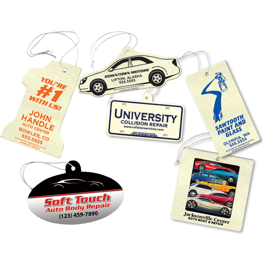 These new Air Fresheners are the perfect item to represent your company to customers in a pleasant way - on a daily basis. Every time your customer opens their vehicle they are reminded of you by a pleasant fragrance and your personalized air freshener. Now that's a great promotional item!