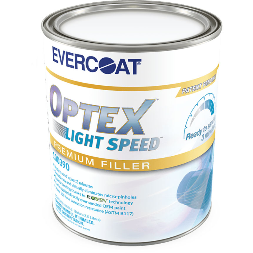Light Speed™ Optex® Premium Body Filler is the world's best sanding dual cure filler offering unparalleled sanding qualities as a result of the Evercoat patented EcoResin™ technology. As an important product in the Light Speed system, the body filler can be cured on demand in 3 minutes with the Light Speed LED lamp. The filler also features patent pending color-change technology in which the body filler optically transitions from pink to a light gray-green when it's ready to sand.