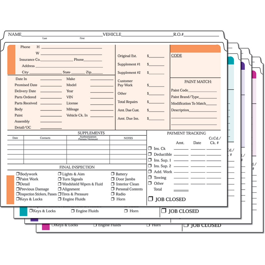 Keep up with all the important documents related to vehicle repair, with these handy color-coded folders. There's room to track supplements, code jobs, and record paint match details. Durable construction withstands repeated wear. Folders feature open ends for easy access. Quantity of 1 = 50