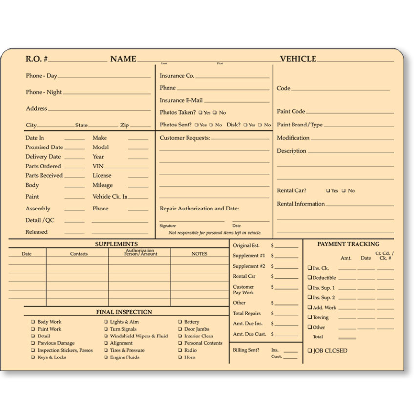 Your customer's name and RO number are printed on the front of the jacket, on a tab that is 1/2" higher than the jacket's back edge, so that the jacket's contents never hide the identification tab. Even if the papers inside happen to slide up a bit, the information never gets covered up.