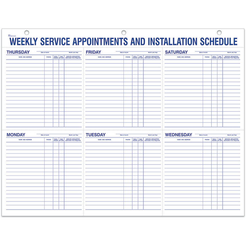 See all of your appointments at a glance. This Weekly Schedule contains fields for date, time of day, customer name, address, phone number, technician, and the service requested.